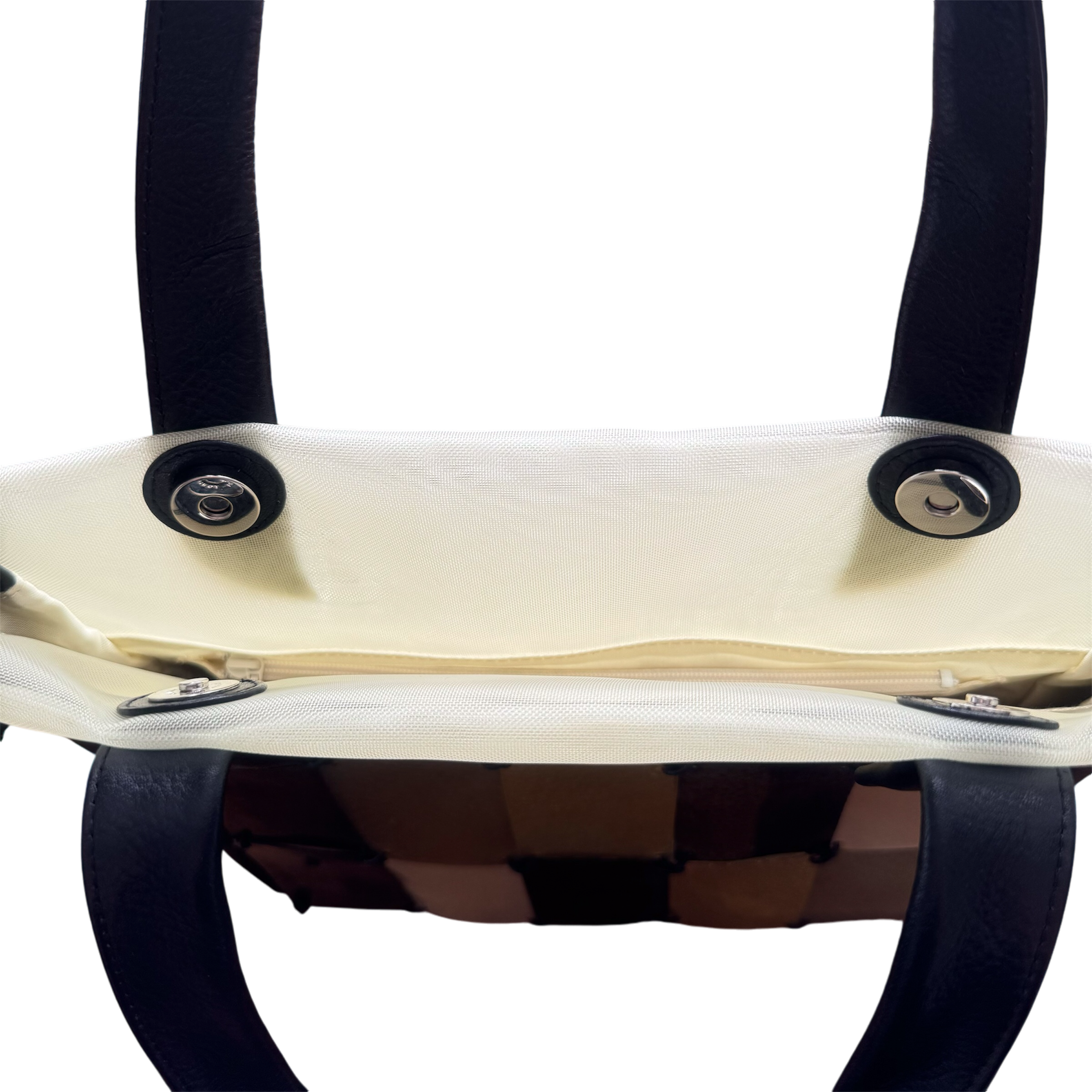 職人が手作業で1枚ずつ仕上げたプレートを並べ丁寧に編んだ、個性が光るハンドバッグ。