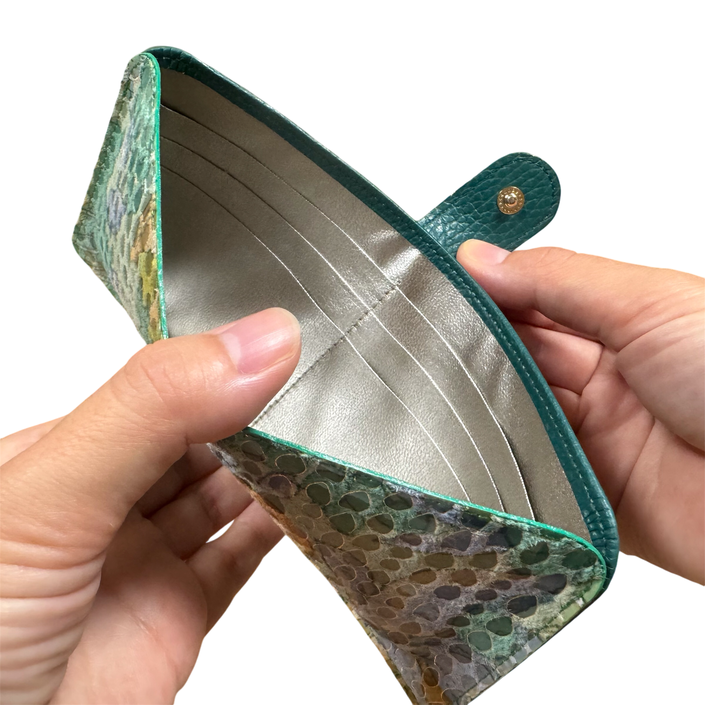 仕様:スナップボタンによる開閉/背面にファスナーポケット1ヶ所/内側に札入れ1ヶ所、カード入れ6ヶ所