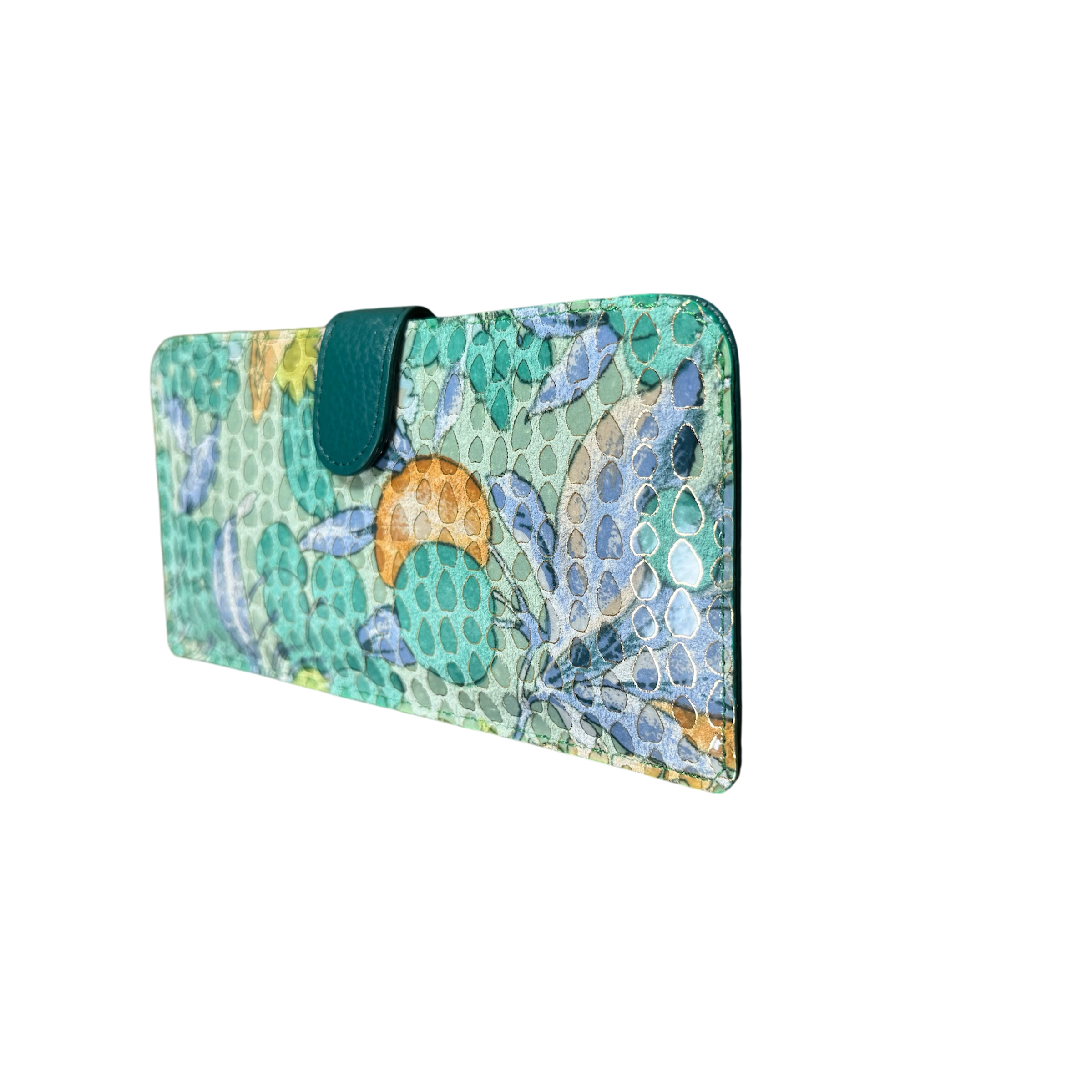 国産の豚革に手捺染でボタニカルな色柄を着色し、しずく型のエナメルと箔をあしらった自社オリジナル素材を使用しています。