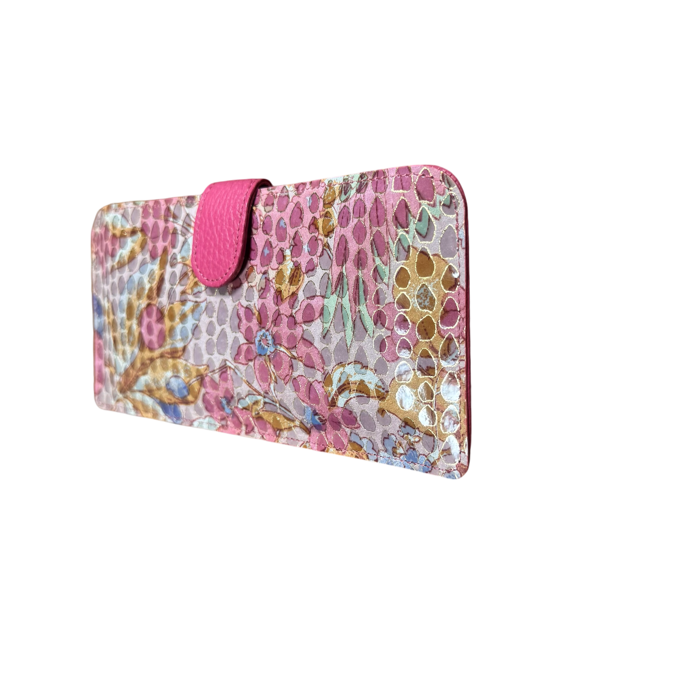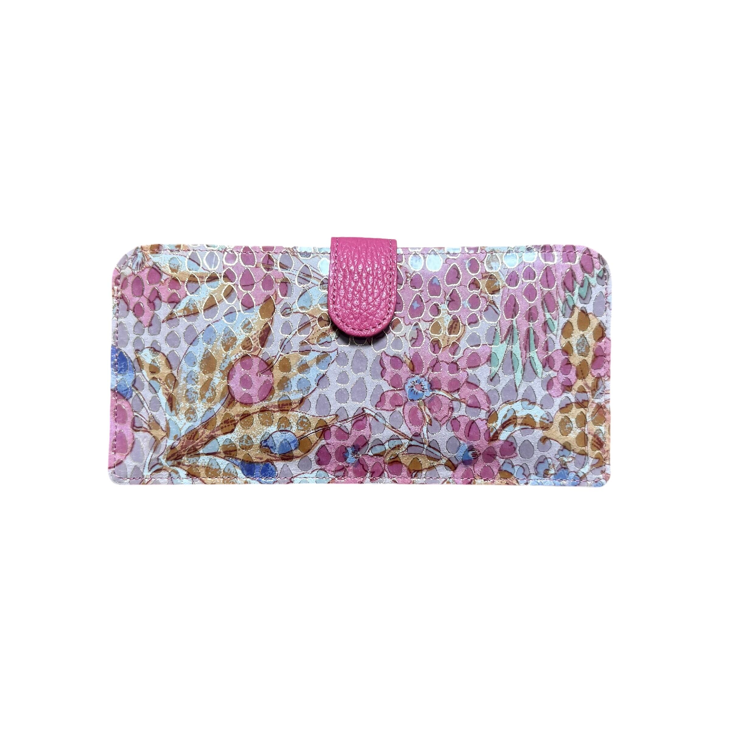 国産の豚革に手捺染でボタニカルな色柄を着色し、しずく型のエナメルと箔をあしらった自社オリジナル素材を使用しています。