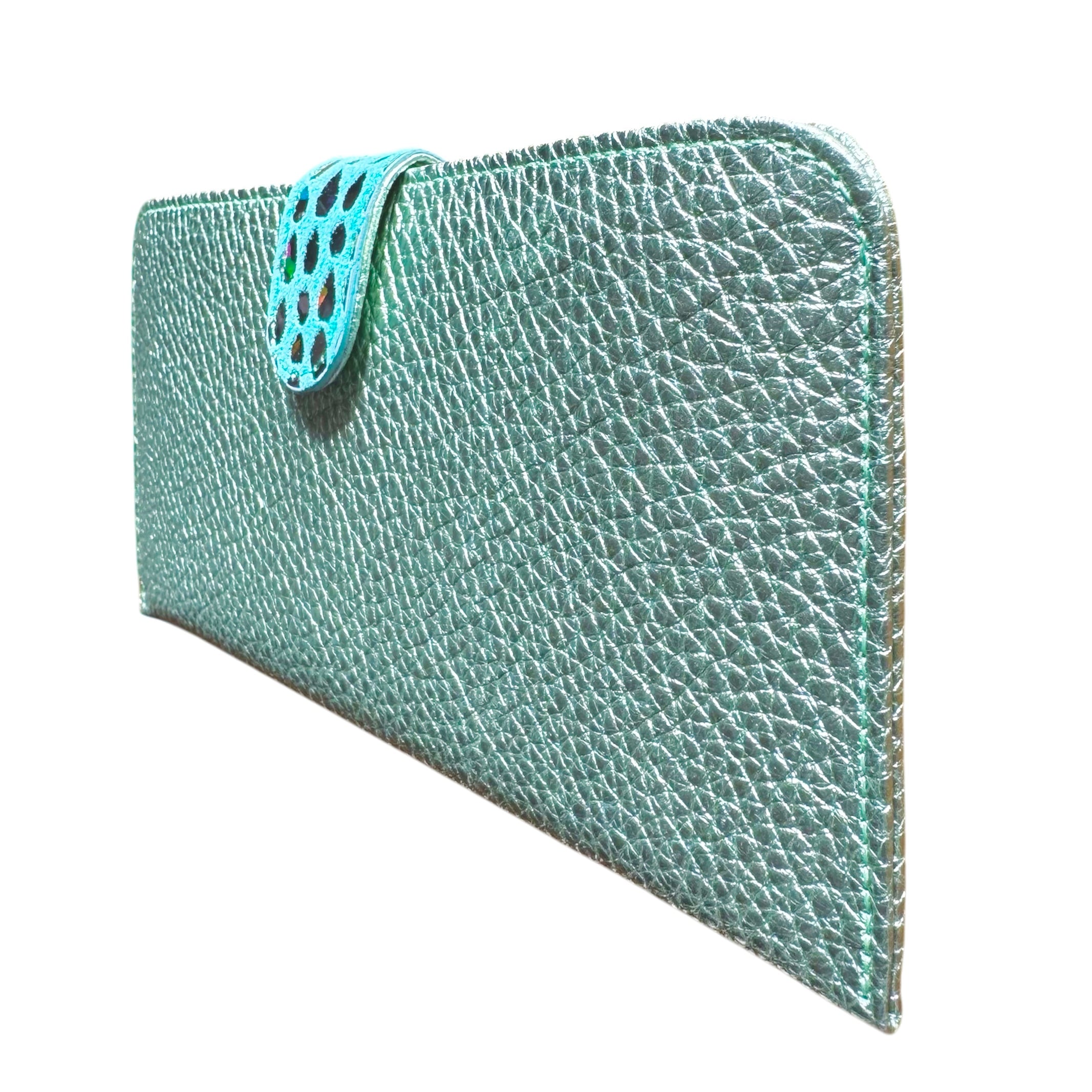 鮮やかにメタリック加工した型押しのシュリンクレザーと、ワンポイントには国産豚革にしずく型のエナメル箔をあしらった自社オリジナル素材を使用しています。