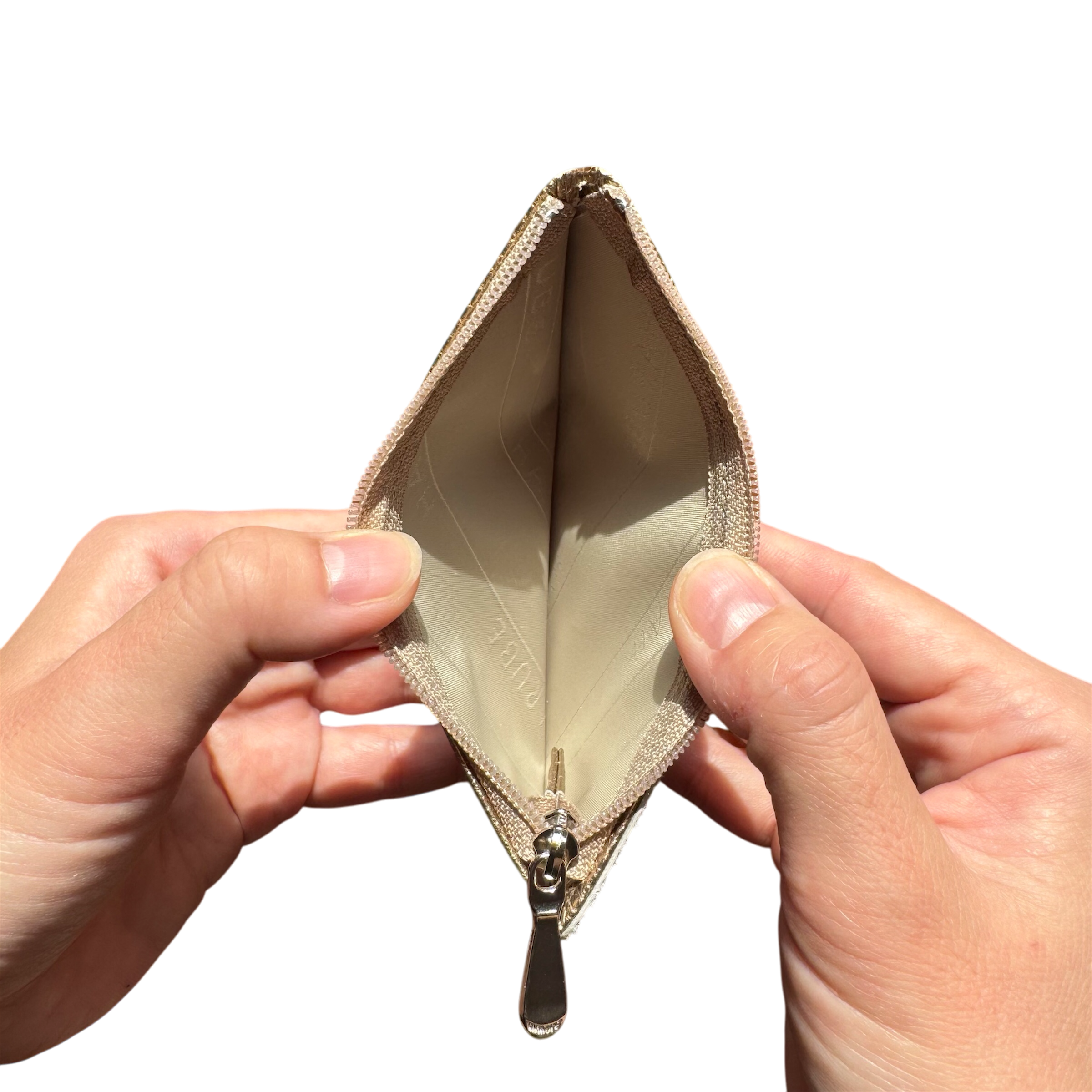小さくスリムでも、表にはよく使うカード1枚を、裏面には5枚の計6枚、ファスナー内にはちょっとの折ったお札と小銭、レシートなどが入ります。