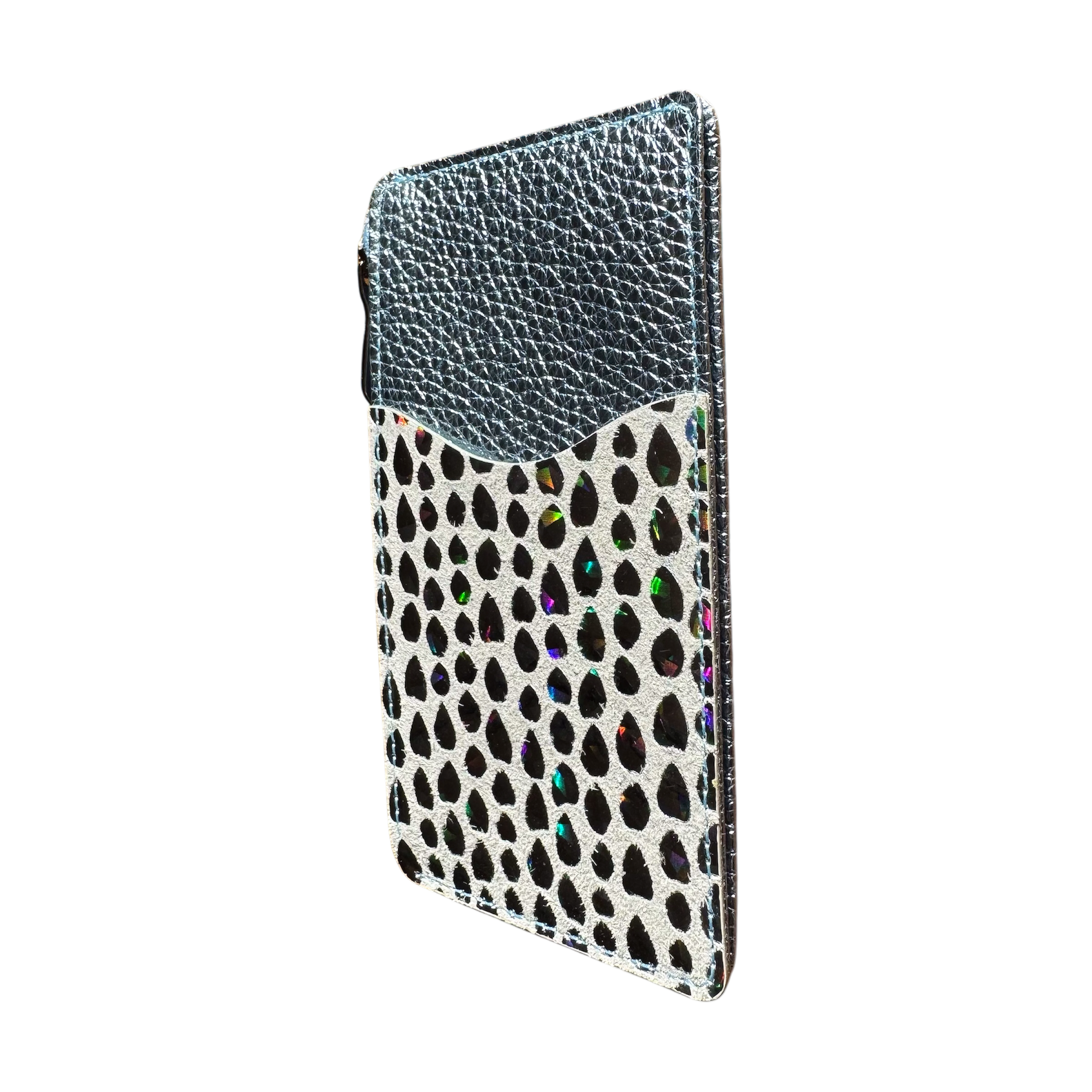 鮮やかにメタリック加工した型押しのシュリンクレザーと、ワンポイントには国産豚革にしずく型のエナメル箔をあしらった自社オリジナル素材を使用しています。